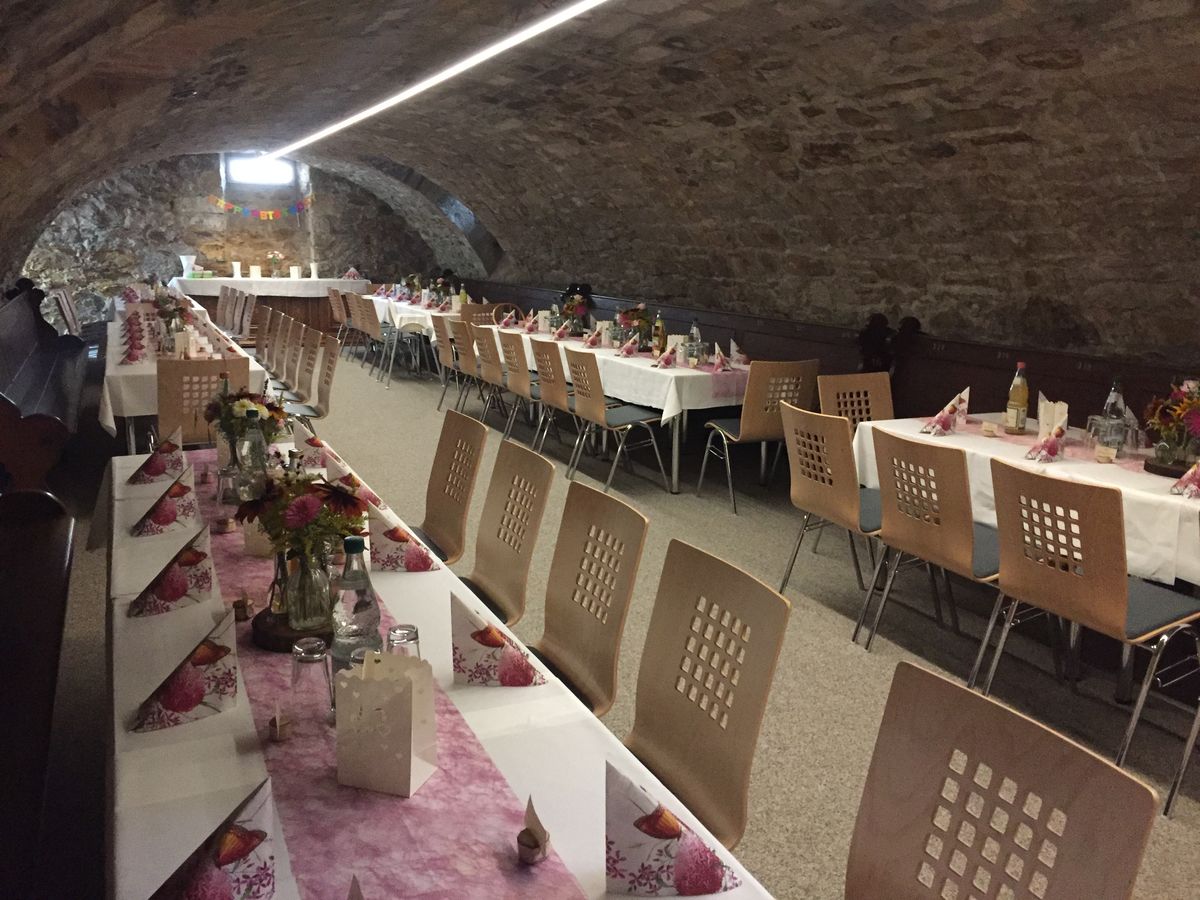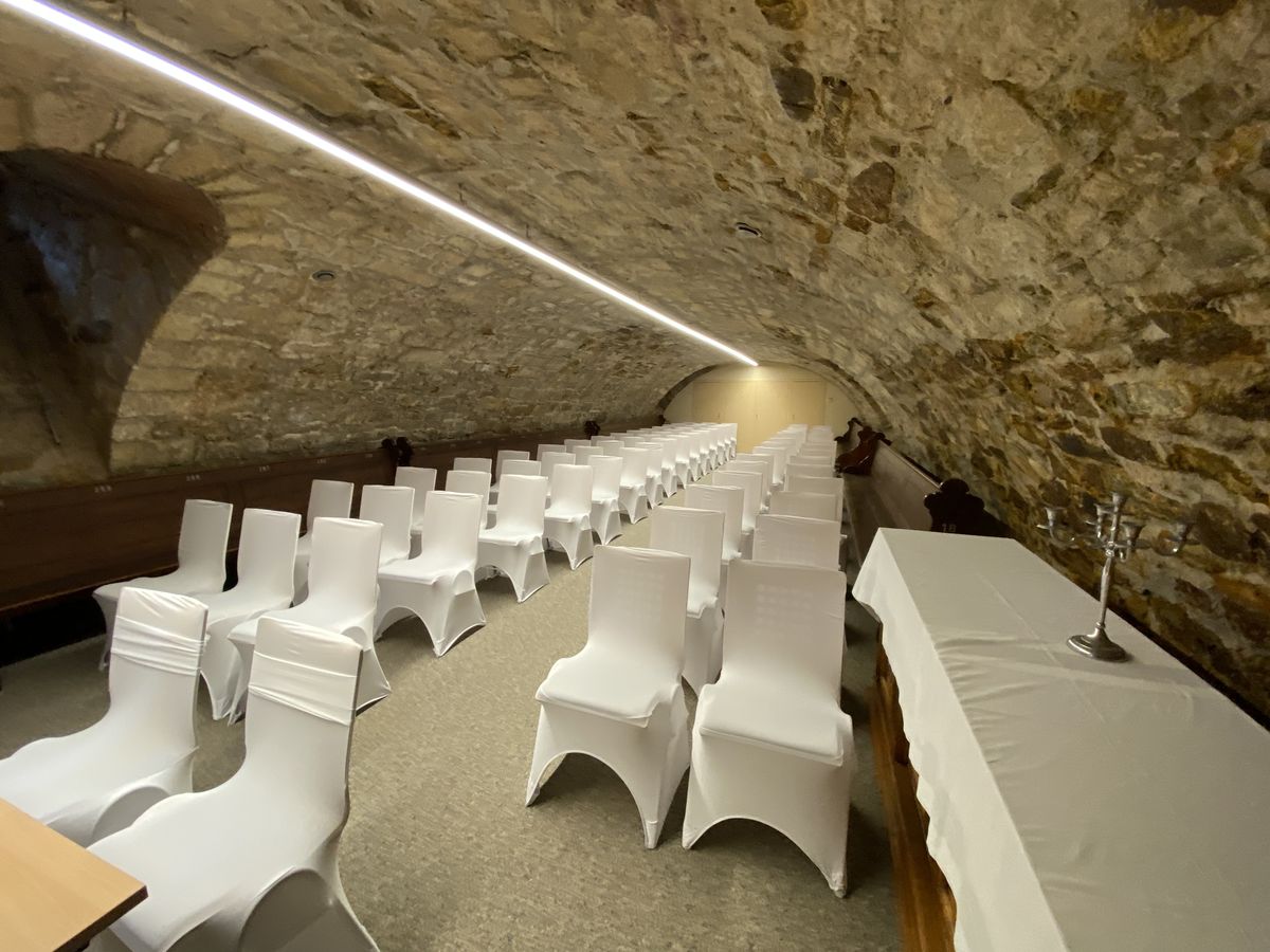Der Weinkeller versprüht gemütlichen Charme unter historischen Tonnengewölben. Besonders in den kühleren Monaten ist dieser Raum die perfekte Wahl für gesellige Feiern in entspannter Atmosphäre. Die zwei verbundenen Gewölbebereiche bieten Ihnen Flexibilität, nutzen Sie einen Bereich oder beide zusammen.