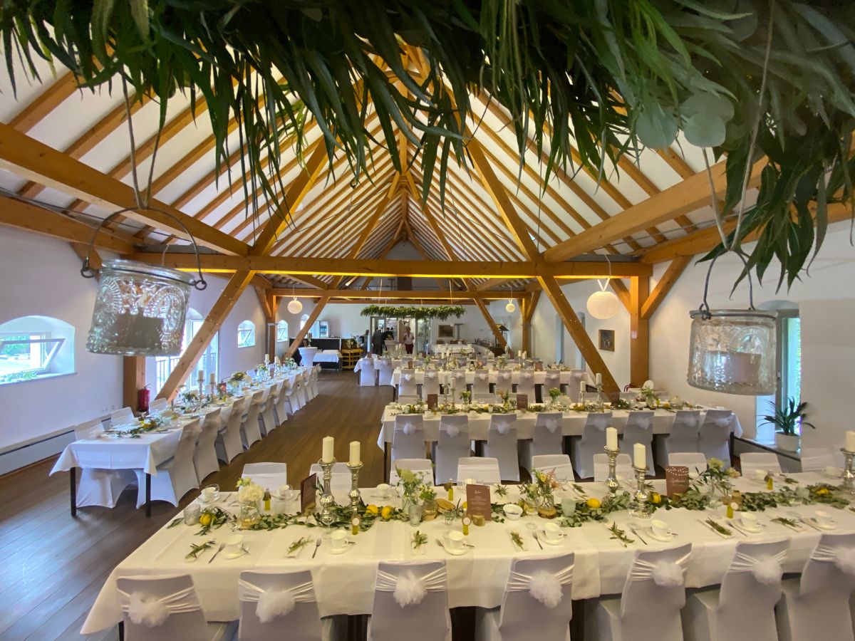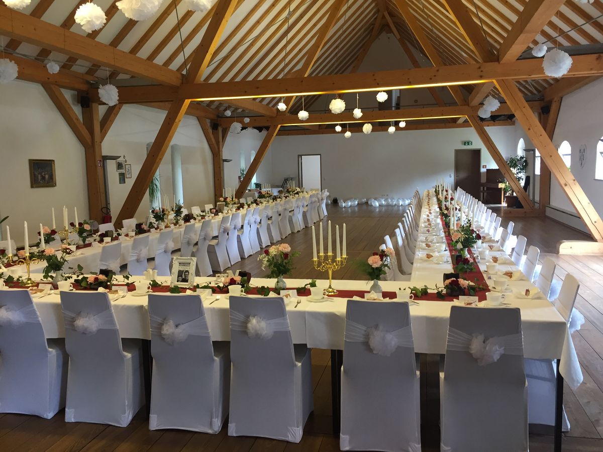 Der Rittersaal verbindet historisches Ambiente mit modernem Komfort. Hohe Decken, helle Räume und die angrenzende Terrasse machen diesen Ort besonders vielseitig. An warmen Tagen können Sie die Gartenanlage mitnutzen, perfekt für Sektempfang oder entspanntes Beisammensein im Freien.