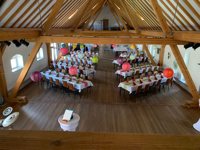 Die Tenne im ersten Obergeschoss besticht durch ihren rustikalen Charme und großzügigen Raum. Hier haben Sie Platz für ausgedehnte Feiern mit Tanz, Musik und guter Laune. Die offene Galerie, die kalte Küche und die komplette Thekenausstattung mit Bierzapfanlage machen die Tenne zu einer rundum ausgestatteten Feier-Location.